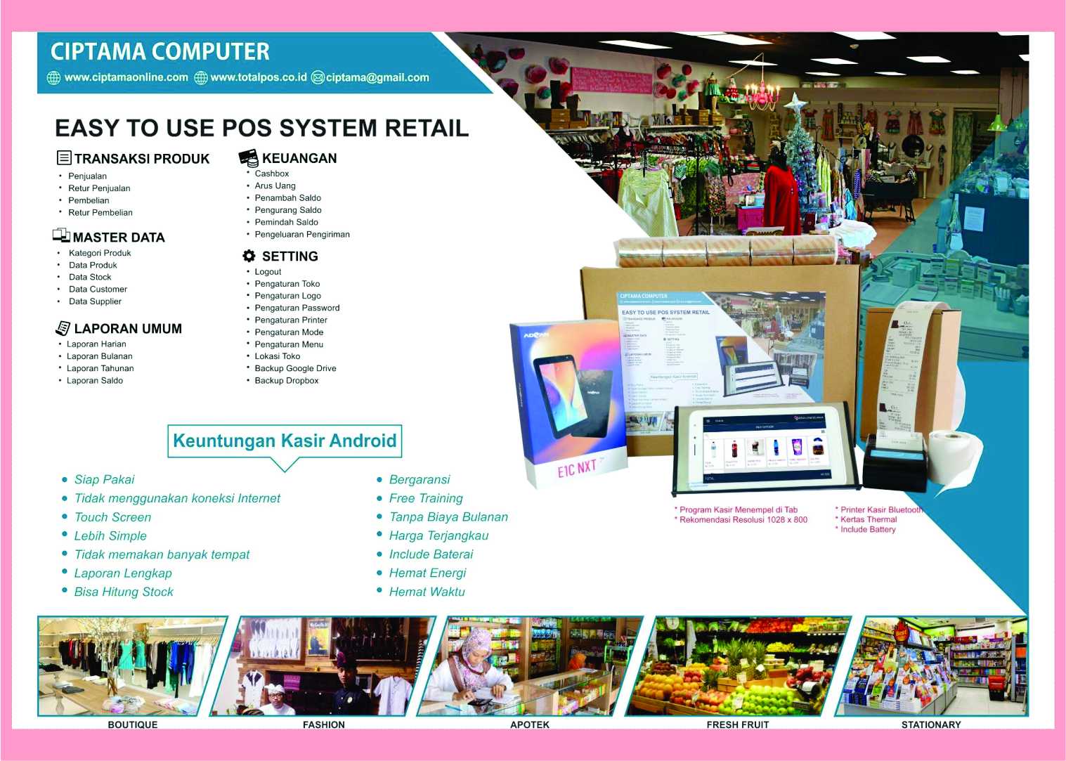 Ciptama Computer adalah ahlinya produk Bermutu, Berkwalitas & Terjangkau untuk Program Kasir & Perangkat kasir, dan telah berdiri sejak Tahun 1993